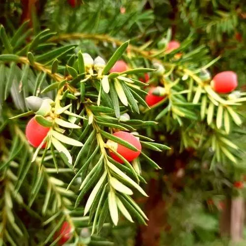 Хвоинки колонновидного тиса Давид имеют продолговатую форму, заостренную на конце, их длина – 1-3 см. Хвоя спирально располагается на побегах, а радиально – на верхушках. Иголки по краю завороченные, голые, блестящие. Часто заметны золотистая окантовка и срединная, снизу матовая жилка. Желтый цвет особенно проявляется при попадании прямых солнечных лучей. В тени хвоя зеленеет.