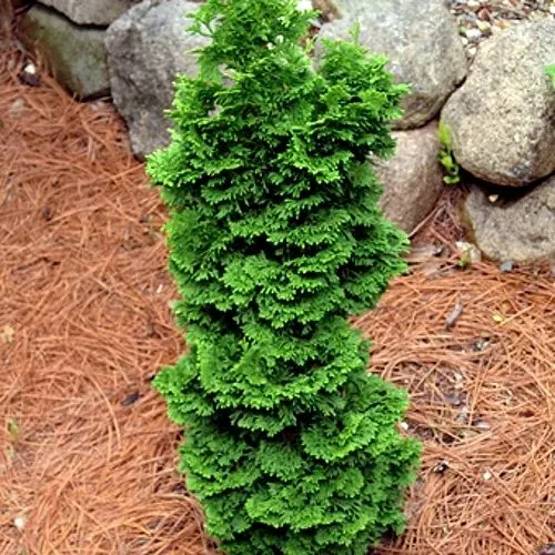 Туя западная Спиралис Мини - нарядный, эффектный сорт с узкопирамидальной, почти колонновидной формой кроны. Плотно посаженные, пушистые, веерообразные ветви скручиваются в спираль. Хвоя мягкая, окрашена глубоким зеленым цветом, зимой приобретает бронзовый оттенок. Растение компактное, невысокое, растет медленно, достигая к 10 годам высоты 0,8 м. С возрастом нижняя часть кроны расширяется.