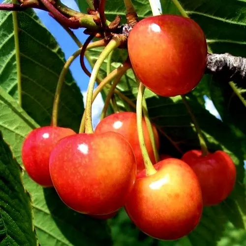 - Округлой формы, одинакового размера, красно-жёлтого цвета, сухого отрыва. Мякоть светло-розового цвета, сочная и плотная. Косточка умеренной величины, овальной формы, легко отделяется от мякоти;