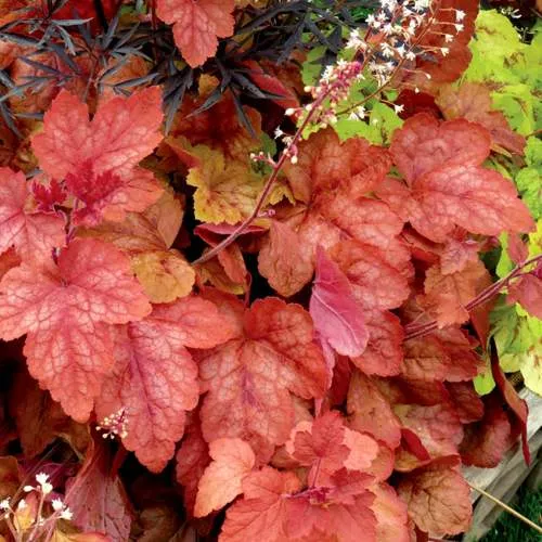 Гейхера Редстоун Фолс выделяется не только своим ростом, но и формой листьев, которые имеют глубокие рассечения и округлые края. В весенний период они радуют глаз зеленым оттенком с нежным желтоватым отливом, в то время как к лету начинают насыщаться рыжими оттенками, а осенью искриться красным. Такой динамичный цветовой переход делает гейхеру идеальным выбором для создания уникального ландшафта.